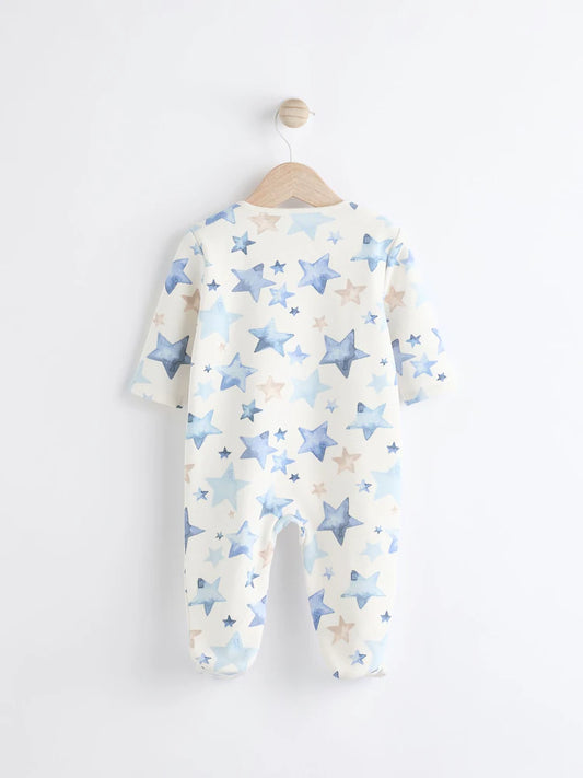 Blue/Cream Star Two Way Zip Fleece Lined Baby Sleepsuit