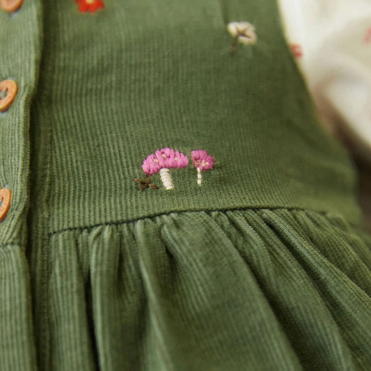 Green cord dress, bodysuit and legging set.