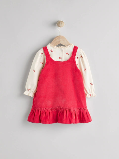 Red 3D Bow Baby Corduroy Pinafore Dress With Tights