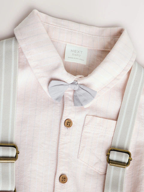 Dress your little one in style with this charming 4-piece baby set in warm apricot orange. The collection includes a comfortable shirt body, coordinating shorts, and decorative braces, creating a complete outfit perfect for special occasions or everyday wear. Soft, quality fabrics ensure all-day comfort for your baby's delicate skin. Mix-and-match pieces offer versatility, allowing you to create different looks throughout the day. An ideal gift for newborns and infants. Shorts, Shirt and Bow Tie 100% Cotton. Braces 88% Polyester, 12% Elastane.