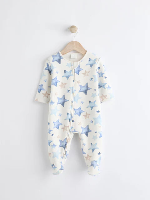 Blue/Cream Star Two Way Zip Fleece Lined Baby Sleepsuit