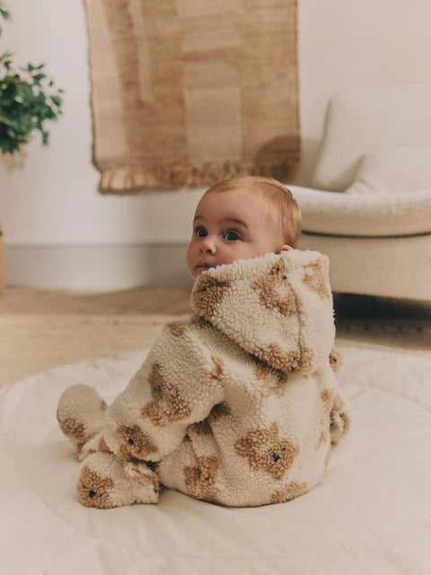 This all-in-one features a soft ecru and tan fleece with an adorable bear print, designed to keep your baby warm and comfortable. The fully lined interior and zip closure offer easy dressing and added insulation, while the hood provides extra protection against chilly weather. Ideal for layering or wearing alone, this cosy fleece is a reliable choice for keeping little ones snug during cooler days.