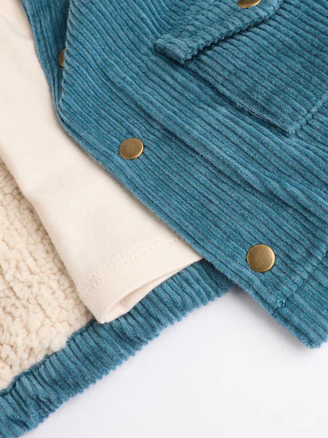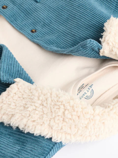This three-piece baby set includes a teal blue shirt and matching trousers, crafted from 100% cotton for optimal breathability and comfort. Designed with delicate softness, it ensures gentle wear on sensitive baby skin while allowing ease of movement. An ideal choice for everyday use or special occasions, this set combines durability with a stylish, coordinated look.